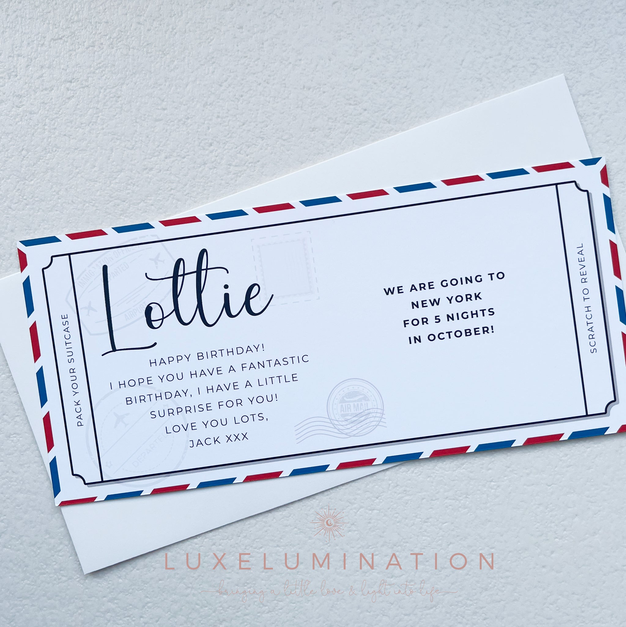 This 'Scratch Off' Trip reveal personalised ticket is a fantastic way to gift your surprise to your loved one! Personalise this ticket with a name printed at the top and then a small personalised message from you and then your trip reveal message, this part will be hidden behind the heart which is a scratch off panel for them to take off with a coin to reveal your message! Please see the pictures for further details.